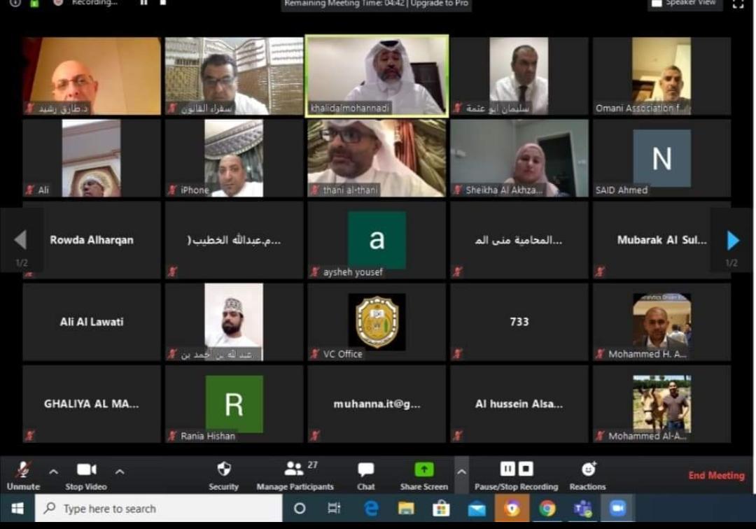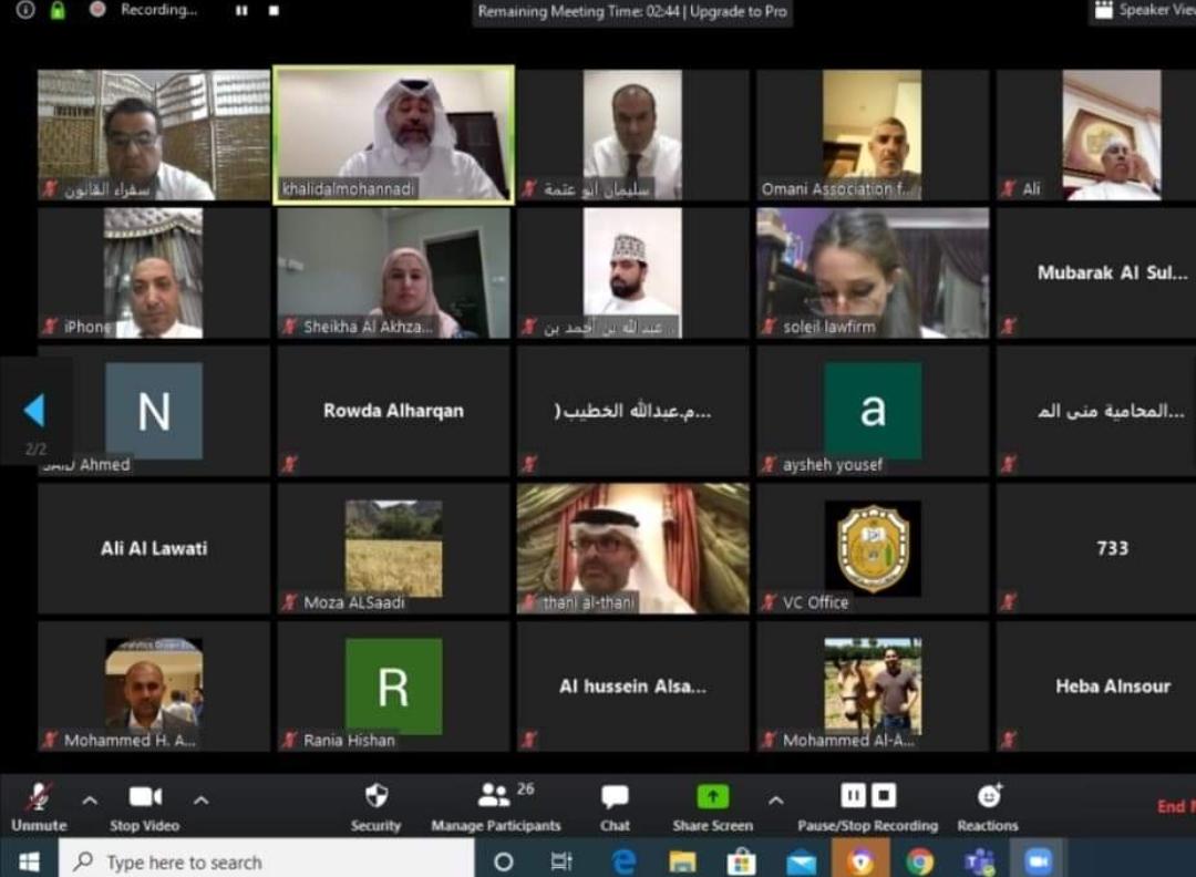 اقامت مبادرة-سفراء-القانون اليوم السبت ٢/٥/٢٠٢٠ ندوة حواريه على تطبيق Zoom  بمناسبة اليوم العالمي للملكية الفكرية تحت عنوان دور المنظمات والمراكز العربية في حماية الملكية الفكرية وقد شارك في الندوة متحدثين مشكورين  كل من الاستاذه الفاضله شيخة بنت ناصر الأخزمي من سلطنة عمان والأستاذ خالد عبدالله المهندي من دولة قطر والدكتور وليد عزت من جمهورية مصر العربية والدكتور سليمان من المملكة الاردنيه  وتم استضافة مشاركين من دول الوطن العربي والخليج العربي.
