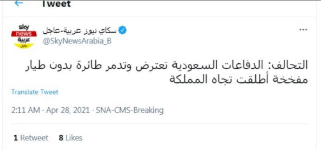 : قالت قوات التحالف العربي في اليمن ان الدفاعات الجوية السعودية اعترضت ودمرت طائرة بدون طيار مفخخة أطلقت تجاه السعودية من الاراضي اليمنية .