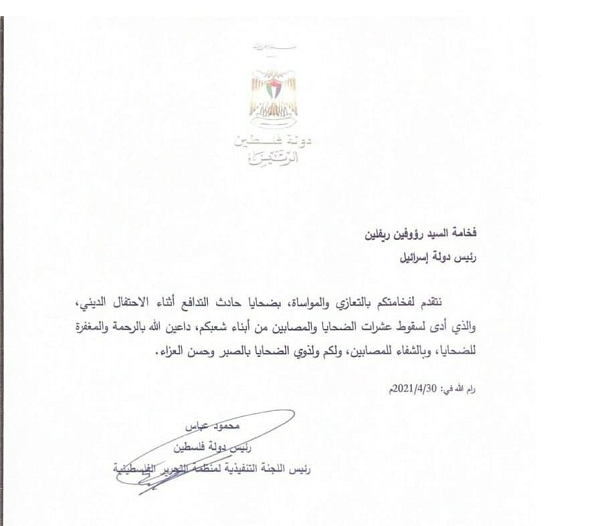 وجاء في نص الرسالة الموجّهة إلى الرئيس الإسرائيلي: "نتقدم لفخامتكم بالتعازي والمواساة، بضحايا حادث التدافع الديني، والذي أدى لسقوط عشرات الضحايا والمصابين من أبناء شعبكم، داعين الله بالرحمة والمغفرة للضحايا، وبالشفاء للمصابين، ولكم ولذوي الضحايا بالصبر وحسن العزاء".