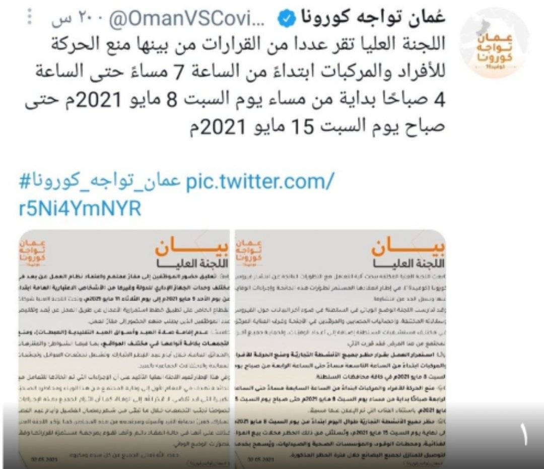 وكشف الحساب الرسمي لجهود مواجهة كورونا في سلطنة عمان "عمان تواجه كورونا" أن اللجنة العليا قررت أيضاً استمرار قرار حظر جميع الأنشطة التجارية بداية من يوم السبت 8 مايو وحتى يوم السبت 15 مايو باستثناء المحلات الغذائية ومحطات الوقود والصيدليات، ومنع الحركة للأفراد والمركبات من الساعة السابعة مساءً حتى الساعة الرابعة صباحاً ابتداءً من مساء يوم السبت 8 مايو وحتى صباح يوم السبت 15 مايو الجاري.