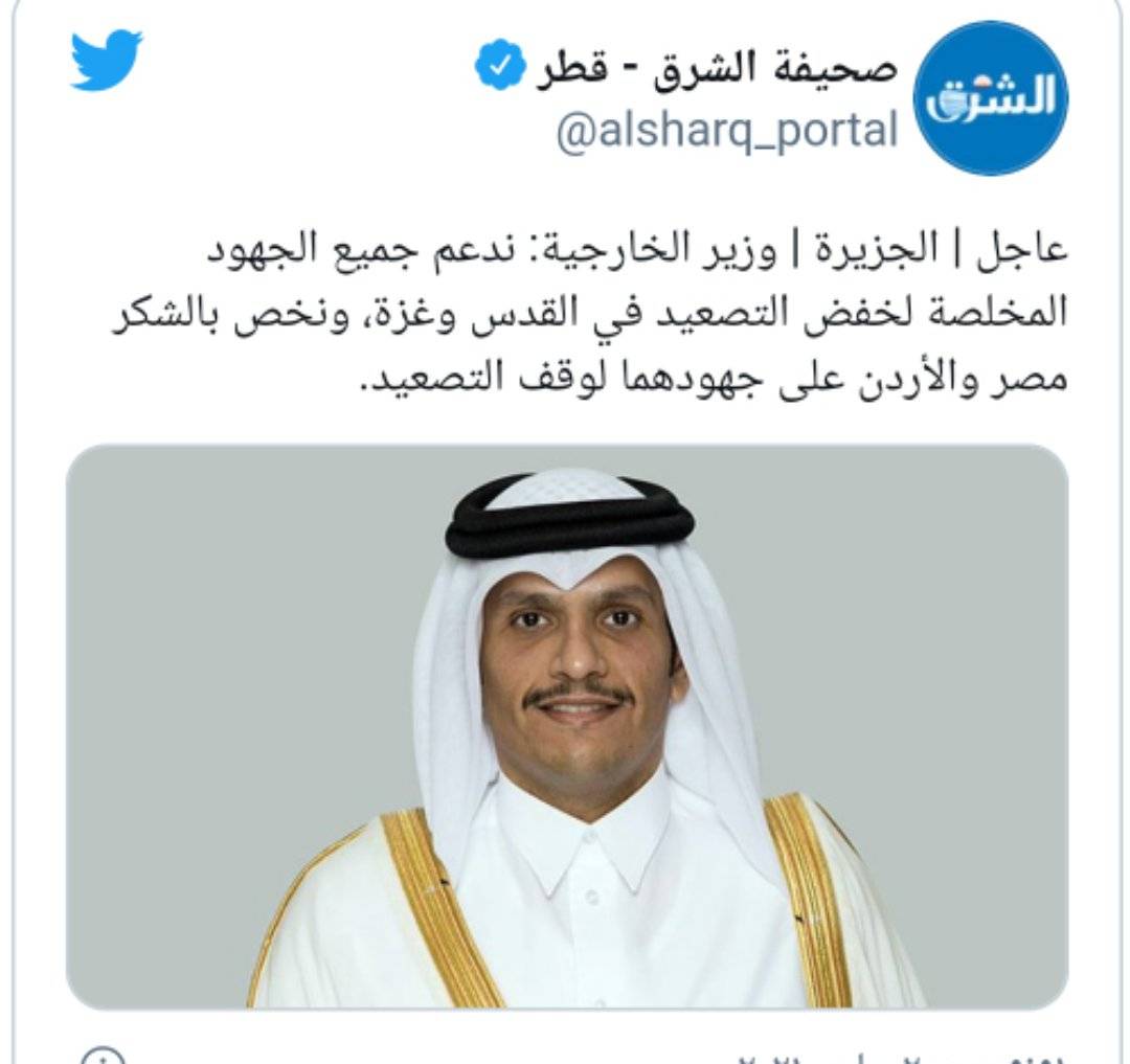 أكد وزير الخارجية القطري، محمد بن عبد الرحمن آل ثاني، أن بلاده تدعم جميع الجهود المخلصة لوقف التصعيد في القدس وغزة، مثمنا الجهود الأردنية والمصرية بهذا الشأن.