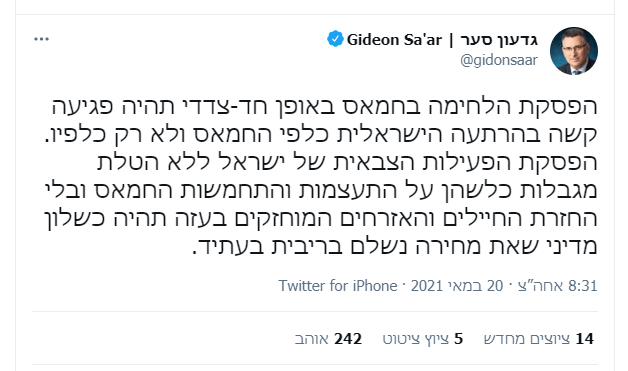وقال جدعون ساعر في تغريدة على "تويتر" إن وقف إطلاق النار دون فرض قيود على حماس وإعادة الجنود والمدنيين "فشل سياسي يدفع ثمنه بالفائدة في المستقبل".