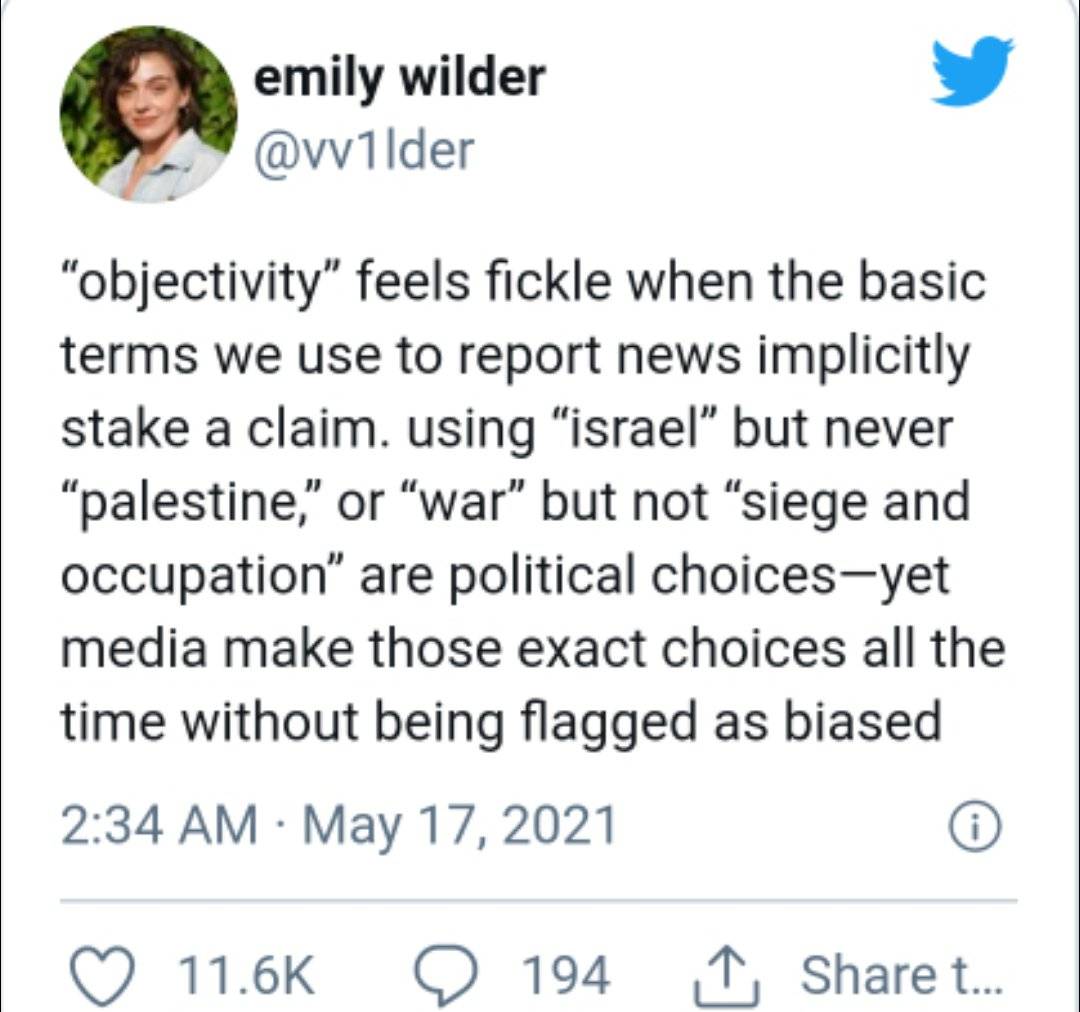 ويوم الأحد الماضي، نشرت الصحفية في حسابها على "تويتر" انتقادها لكيفية تعاطي وسائل الإعلام للوضع في الشيخ جراح، وكتبت: "تبدو الموضوعية متقلبة عندما تتضمن المصطلحات الأساسية التي نستخدمها للإبلاغ عن الأخبار ضمنيا على ادعاءات".. "استخدام" إسرائيل "وليس" فلسطين "أو" الحرب "وليس" الحصار والاحتلال "هي خيارات سياسية، ومع ذلك تتخذ وسائل الإعلام هذه الخيارات الدقيقة طوال الوقت دون تمييزها على أنها منحازة".