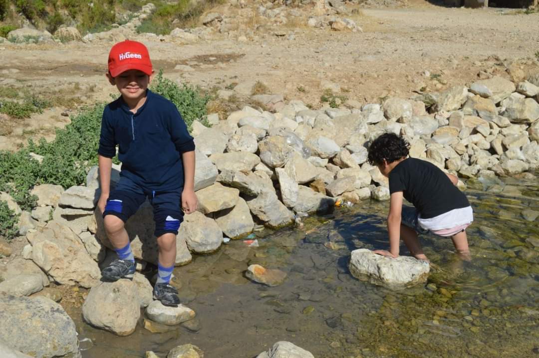 وبعد فترة من الاستراحة تحت عبق الأشجار اتجهنا إلى نبع " عين الزرقاء "  على بعد أكثر من كيلو متر من وادي الليمون  ، وصلنا سيرا على الأقدام إلى منبع العين وكنا منهكين تحت أشعة الشمس الحارقة، واقتربنا من مصبها وهي تنساب إلى الوادي ،  لعب اطفال المسار بمياه النبع الأزلية التي كانت تنبع من جوف الوادي  وصوت ضحكاتهم يعلو في المكان ، وأكثر ما استفز المشاركين في تلك الجولة البيئية  أن المياه لا تستغل وتذهب مياهها هدرا، لا احد يهتم بها وهذا ترك أثرا حزينا لدى المتواجدين من الفريق .