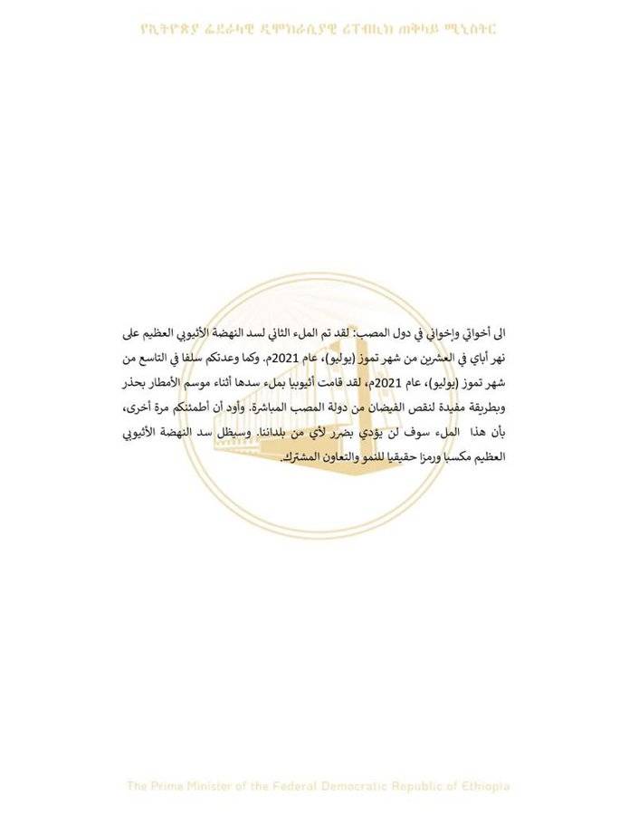 وقال رئيس الوزراء الإثيوبي في نص رسالته: "إلى أخواتي وإخواني في دول المصب لقد تم الملء الثاني لسد النهضة الإثيوبي العظيم على نهر أباي في العشرين من شهر تموز، عام 2021".