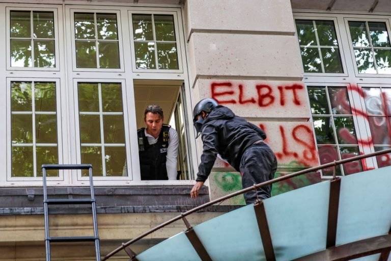 أغلق نشطاء ومتضامنون مع القضية الفلسطينية، الجمعة، المقر الرئيس لشركة "Elbit System”، احتجاجاً على استمرار توريدها الأسلحة لإسرائيل حيث يتم استخدامها في قتل الفلسطينيين.