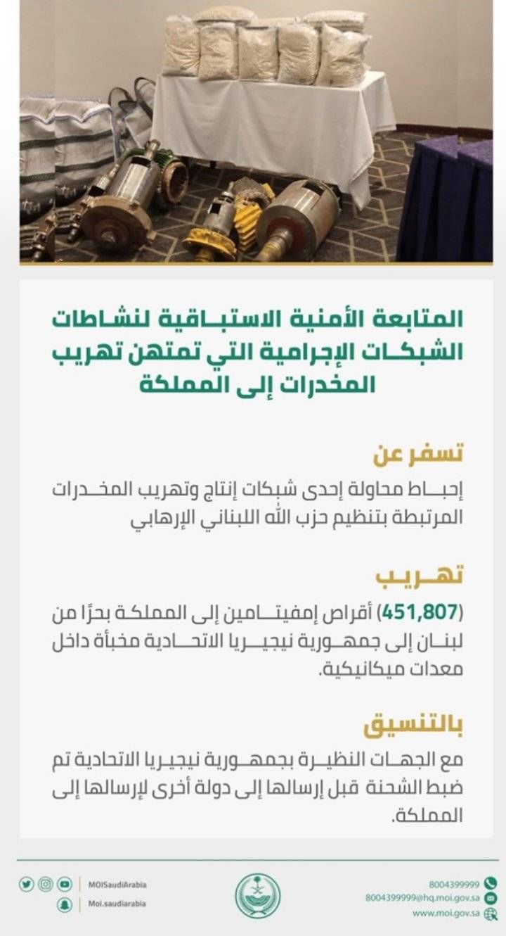 نيروز الإخبارية : صرح المتحدث الأمني لوزارة الداخلية السعودية العقيد طلال الشلهوب، بأن المتابعة الأمنية الاستباقية لنشاطات الشبكات الإجرامية التي تمتهن تهريب المخدرات إلى المملكة، أسفرت عن إحباط محاولة إحدى شبكات إنتاج وتهريب المخدرات المرتبطة بتنظيم حزب الله اللبناني الإرهابي، لتهريب (451,807) أقراص إمفيتامين إلى المملكة، بحرا من لبنان إلى جمهورية نيجيريا الاتحادية، مخبأة داخل معدات ميكانيكية، حيث تم بالتنسيق مع الجهات النظيرة بجمهورية نيجيريا ضبطها قبل شحنها إلى دولة أخرى وإرسالها إلى المملكة.