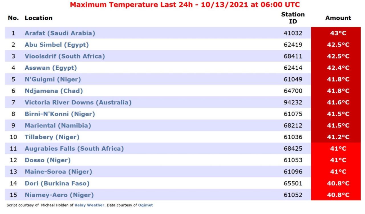ونشر عيد الله المسند بيانات من موقع "eldoradoweather" متخصص في رصد درجات الحرارة، تظهر أن السعودية تحتل المركز الأول في قائمة أعلى درجة مسجلة في العالم خلال آخر 24 ساعة، وهي "43 درجة مئوية .