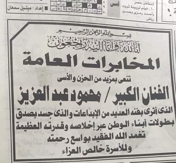 في واقعة هي الأولى من نوعها، نشر جهاز المخابرات العامة المصرية نعياً في جريدة قومية، يرثى فيه فنان والذي فارق عالمنا عام ٢٠١٦ .