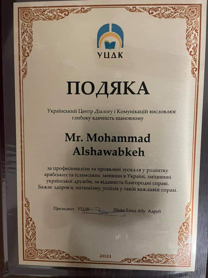 قدّم المركز الأوكراني للتواصل والحوار شهادة ودرع تقديري للإعلامي الأردني محمد الشوابكة لجهوده الإعلامية المتميزة والتي تُوّجت بتأسيسه لموقع " بوّابة أوكرانيا " والتي تعرض مادّتها باللغة الأوكرانية والعربية والإنجليزية وأصبحت خلال سنة من تأسيسها المنصّة الإعلامية العربية الأولى في أوكرانيا حسب تقييم موقع جوجل .