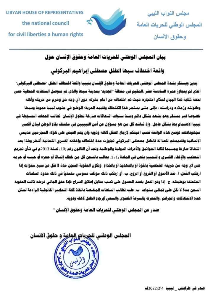 استنكر المجلس الوطني للحريات العامة وحقوق الإنسان في ليبيا اختطاف الطفل مصطفى  البركولي الذي لم يتجاوز عمره السادسة عشر  حيث أنه  يقيم في منطقة الجديد بمدينة  سبها .