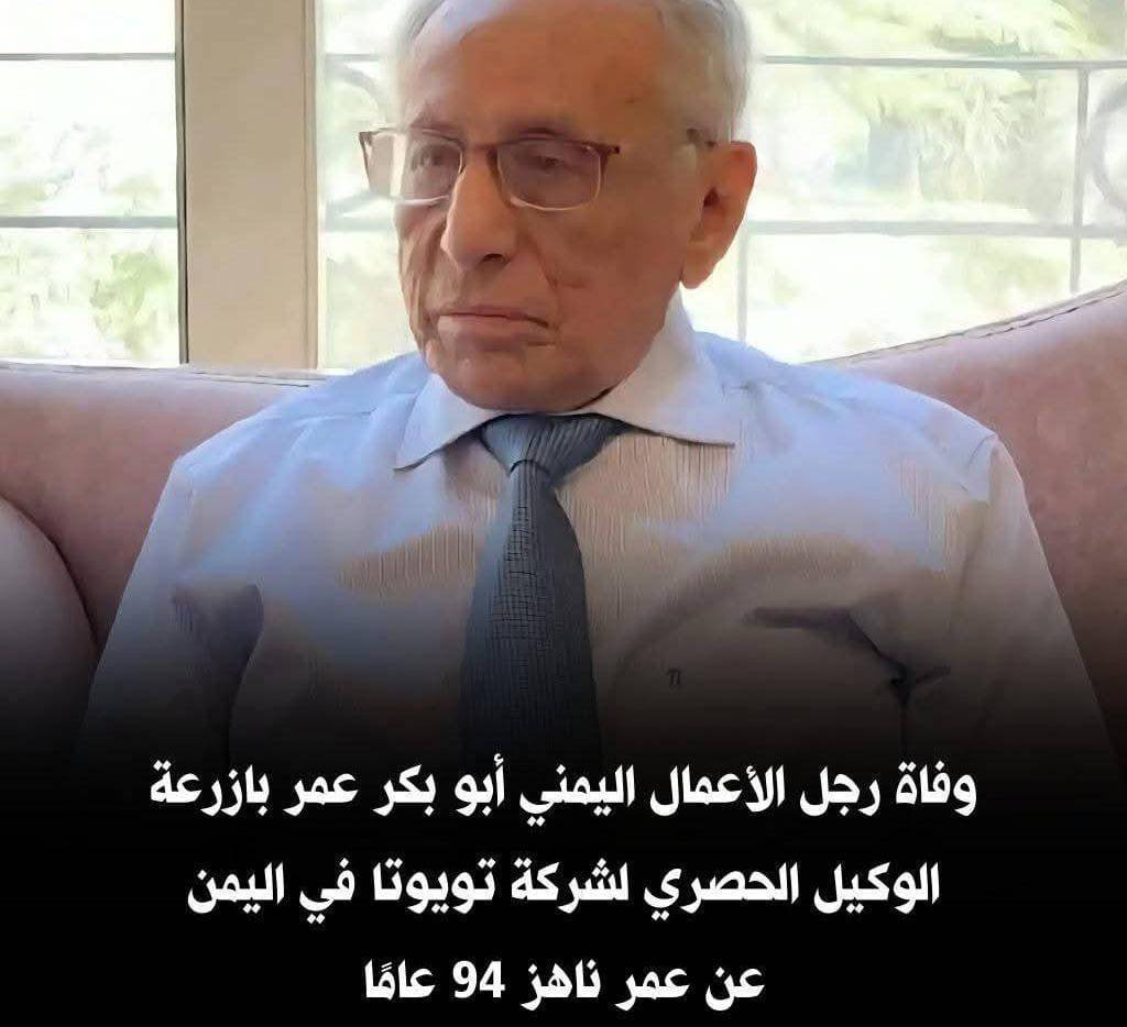 توفي يوم امس ، في العاصمة الأردنية عمّان، رجل الأعمال المعروف أبو بكر عمر أحمد بازرعة، مؤسس "المركز التجاري للسيارات والمحركات" والوكيل الحصري لشركة تويوتا في اليمن منذ العام 1956.