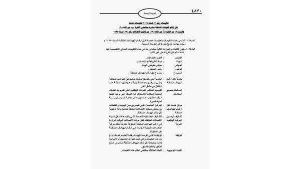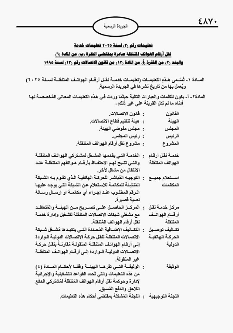 صدرت في الجريدة الرسمية، اليوم الأربعاء، تعليمات خدمة نقل أرقام الهواتف المتنقلة لسنة (2025).