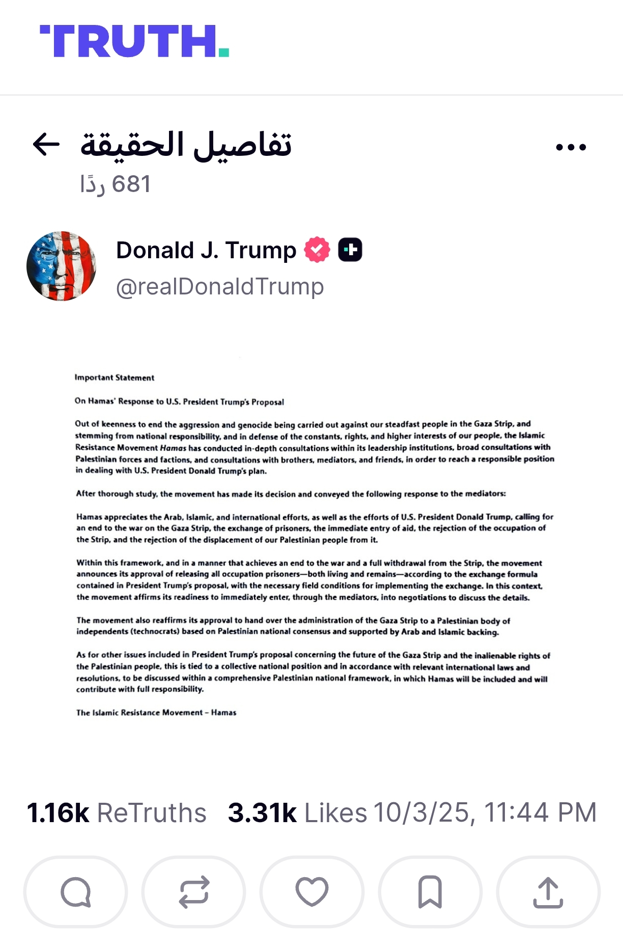 ترامب ينشر بيان حماس حول قبول خطته على "تروث سوشال" دون تعليق