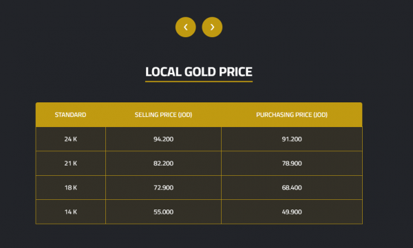 ووفقاً للنشرة اليومية الصادرة عن النقابة العامة لأصحاب محالّ تجارة وصياغة الحلي والمجوهرات، ارتفع سعر الغرام الواحد من الذهب لعيارات 24 و18 و14، ليسجل 94.2 ديناراً و72.9 ديناراً و55 ديناراً على الترتيب، وذلك لغايات البيع لدى محالّ الصياغة.
