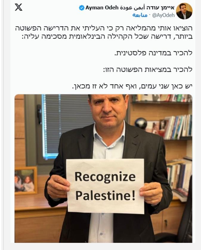"لكل من يعيش في فقاعة الكنيست المنعزلة: رغم حكومة يمينية بالكامل، ورغم الاستخدام الساخر لأحداث السابع من أكتوبر، ورغم حرب الإبادة، فشلت حكومة الجرائم في تغيير المعادلة البسيطة، وهي أن هناك شعبان هنا، وسيبقيان هنا".