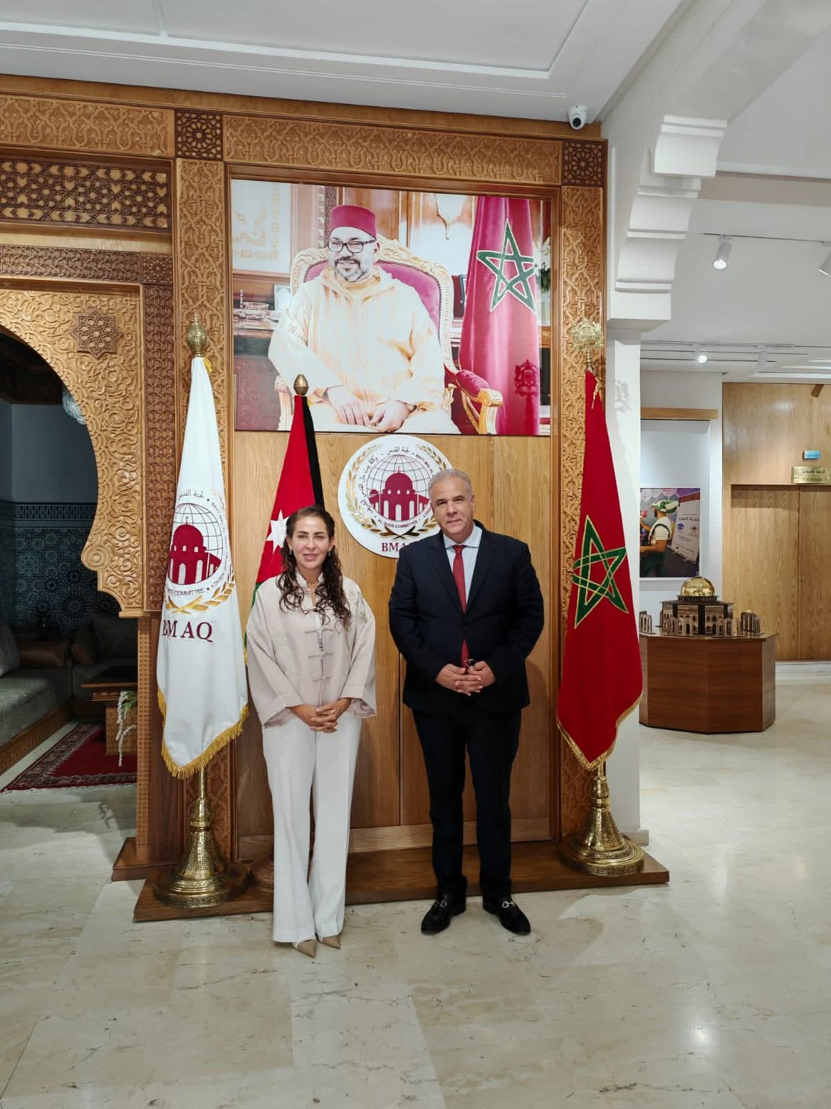 قامت سفيرة المملكة الأردنية الهاشمية لدى المملكة المغربية، جمانة غنيمات، بزيارة إلى مقر وكالة بيت مال القدس الشريف في الرباط، حيث كان في استقبالها المدير المكلف بتسيير الوكالة، السيد محمد سالم الشرقاوي.