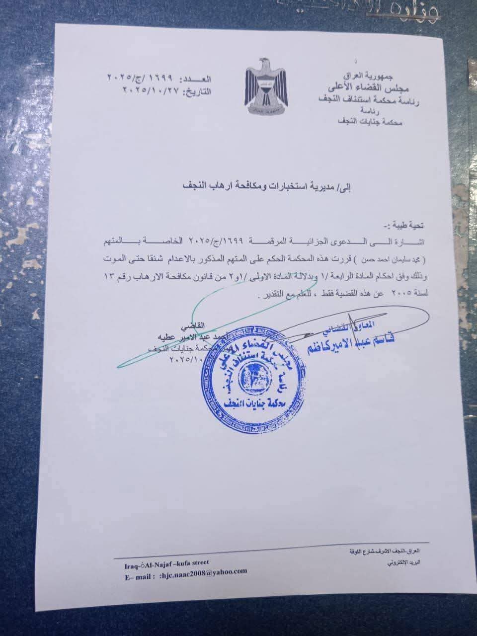 وبحسب المعلومات المتداولة، فقد صدر حكم الإعدام مؤخراً بحق محمد من قبل إدارة محكمة النجف، ما أثار حالة من الغضب والاستنكار بين رواد مواقع التواصل الاجتماعي الذين اعتبروا الحكم قاسياً وغير مبرر.