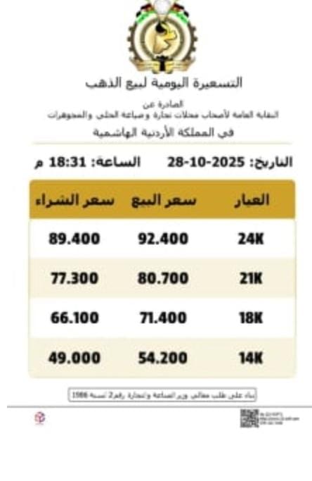 أصدرت نقابة أصحاب محلات الذهب والمجوهرات في العاصمة تسعيرةً رابعة للذهب اليوم الثلاثاء.