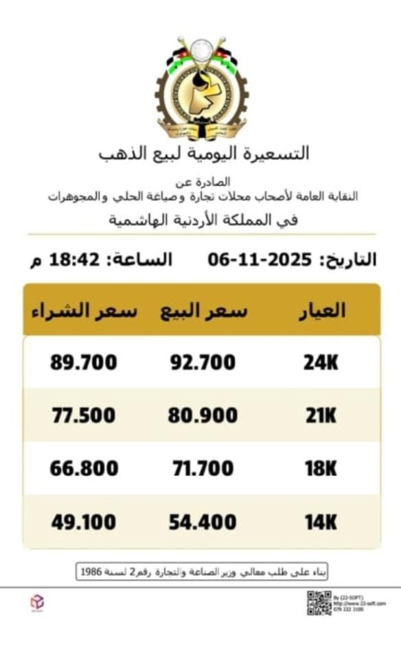 انخفاض جديد .. تسعيرة ثالثة للذهب في الأردن