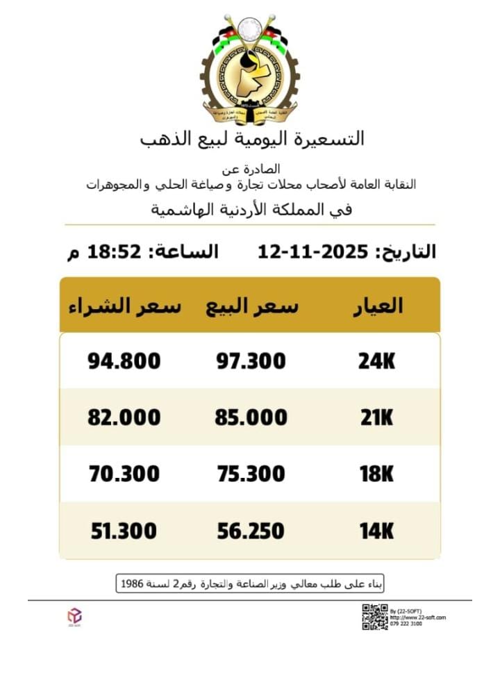 وبلغ سعر غرام الذهب من عيار 21 "الأكثر تداولاً بين المواطنين" 85 دينار ، فيما بلغ سعر الشراء 82 دينار .