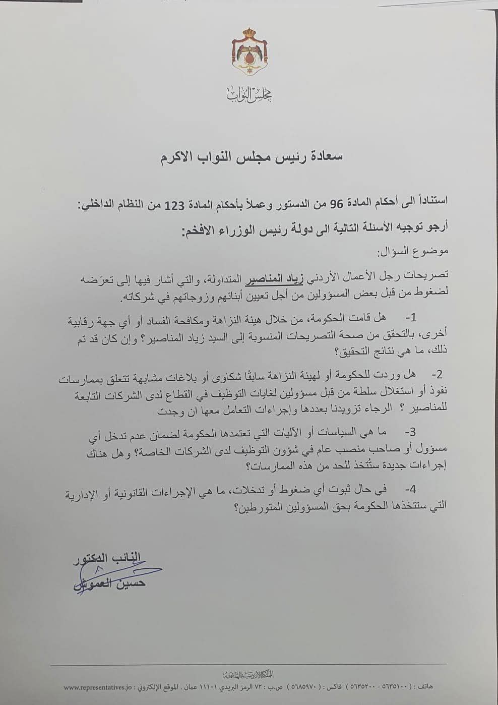 وجّه النائب الدكتور حسين العموش سؤالًا نيابيًا إلى رئيس الوزراء الدكتور جعفر حسان، طالب فيه الحكومة بتوضيح موقفها من التصريحات المتداولة لرجل الأعمال الأردني زياد المناصير، والتي تحدث فيها عن تعرّضه لضغوط من بعض المسؤولين لتعيين أبنائهم وزوجاتهم في شركاته.