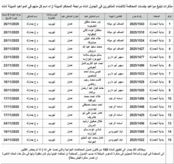 وطلبت المذكرات من المذكورين في الجداول أدناه، والمنشورة في الصحف اليومية، مراجعة المحاكم المبينة إزاء اسم كل منهم في المواعيد المبينة أدناه. وتاليا الأسماء والتفاصيل: