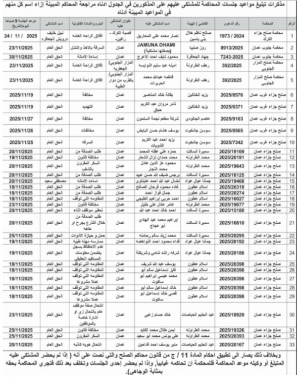 نيروز الإخبارية : صدرت اليوم الاثنين مذكرات تبليغ مواعيد جلسات المحاكمة لمشتكى عليهم ولمتهمين ولأظناء وقرارات إمهال.