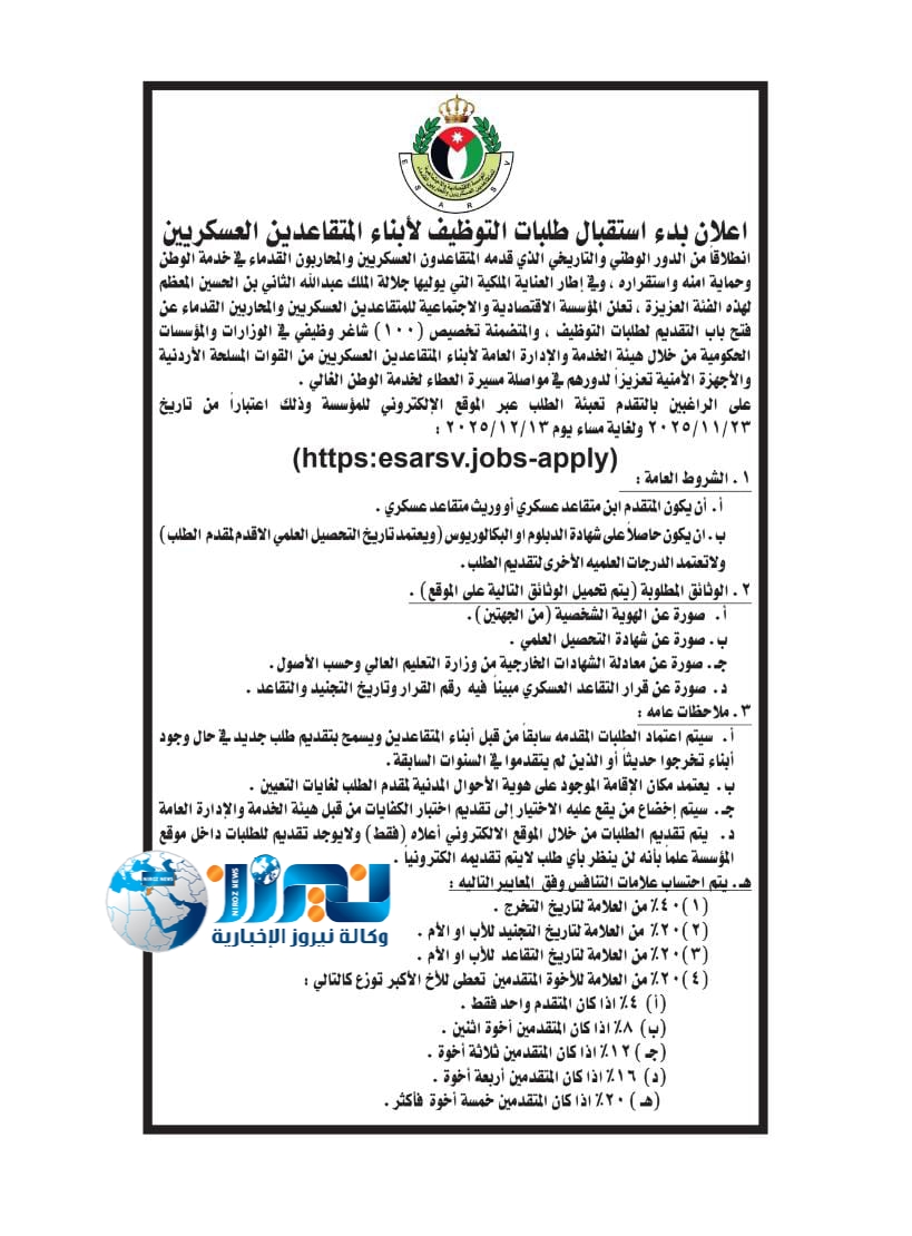 تعلن  المؤسسة الاقتصادية والاجتماعية للمتقاعدين العسكريين والمحاربين القدماء عن فتح باب التقديم لطلبات التوظيف، والمتضمن تخصيص (100) شاغر وظيفي في الوزارات والمؤسسات الحكومية من خلال هيئة الخدمة والإدارة العامة، وذلك لأبناء المتقاعدين العسكريين من القوات المسلحة الأردنية والأجهزة الأمنية، تعزيزًا لدورهم في مواصلة مسيرة العطاء وخدمة الوطن الغالي.