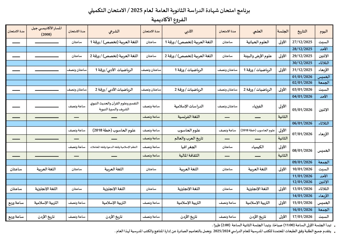 كما أكدت أن الكتب المقررة للامتحان التكميلي لعام 2025 هي كتب الطلبة النظاميين للعام الدراسي 2024/2025 (كتب مواليد 2007 و2008).