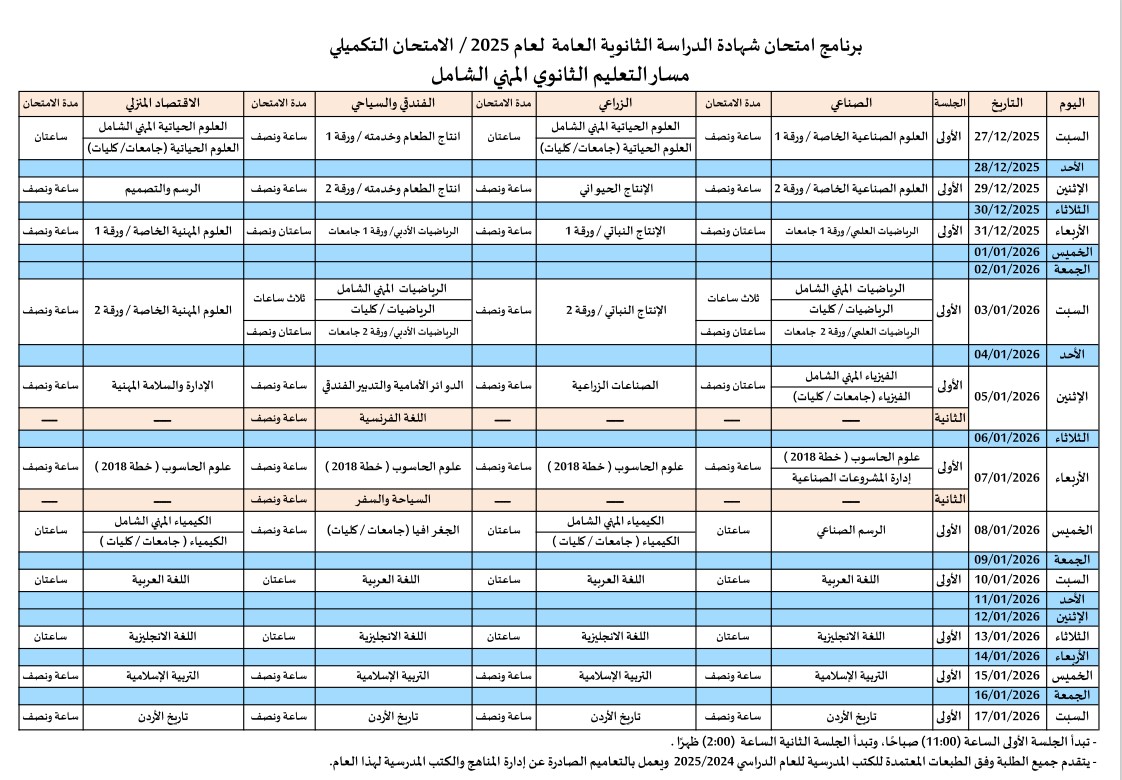 وتنطلق أولى جلسات الامتحان يوم السبت 27 كانون الأول 2025، وتختتم يوم السبت 17 كانون الثاني 2026، إذ تبدأ الجلسة الأولى يوميًا عند الساعة 11 صباحًا، فيما تبدأ الجلسة الثانية عند الساعة 2 بعد الظهر.