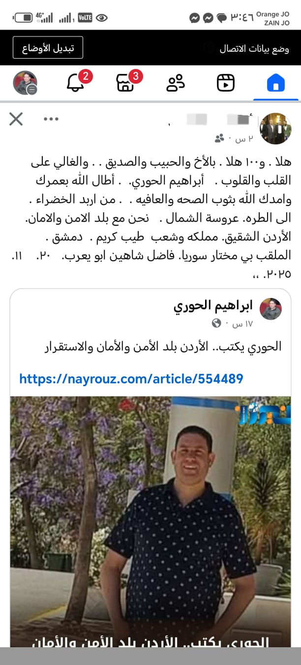 أشاد مواطن سوري يعرف ب فاضل شاهين ابو يعرب  عبر صفحته الرئيسية بفيسبوك  بالمقال الذي كتبه الزميل إبراهيم الحوري والذي عنوانه " الأردن بلد الأمن والأمان والاستقرار" .