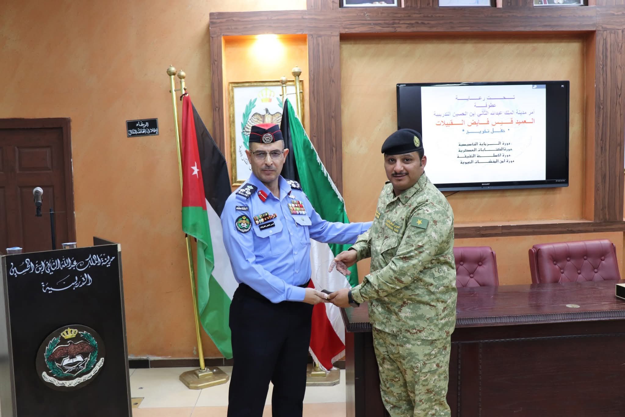 احتفل يوم أمس الخميس  فـــــي مــدينة الملـك عبداللـه الثاني ابن الحــسين التدريبية بحضور آمر المدينةالتدريبية العميد قيس القبيلات بتخريج عدد من الدورات التدريبية والشرطية والتي اشترك فيها عدد من مرتبات مديرية الامن العام ومن كافة التشكيلات وعدد من ضباط الصف من دولة الكويت الشقيقة.