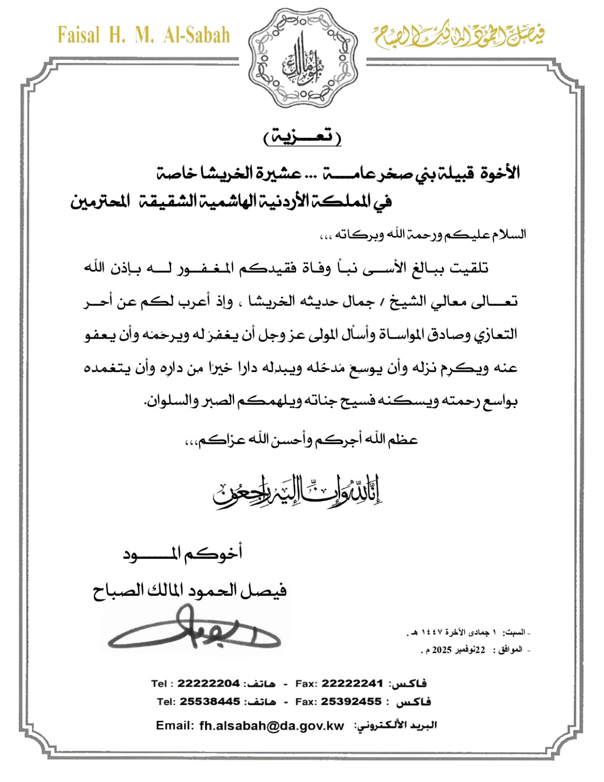 يتقدّم معالي الشيخ فيصل الحمود آل الصباح بأحرّ التعازي والمواساة إلى قبيلة بني صخر بوفاة الشيخ جمال حديثة الخريشا، سائلين الله العلي القدير أن يتغمّده بواسع رحمته، ويسكنه فسيح جناته، وأن يلهم أهله وذويه الصبر والسلوان.
