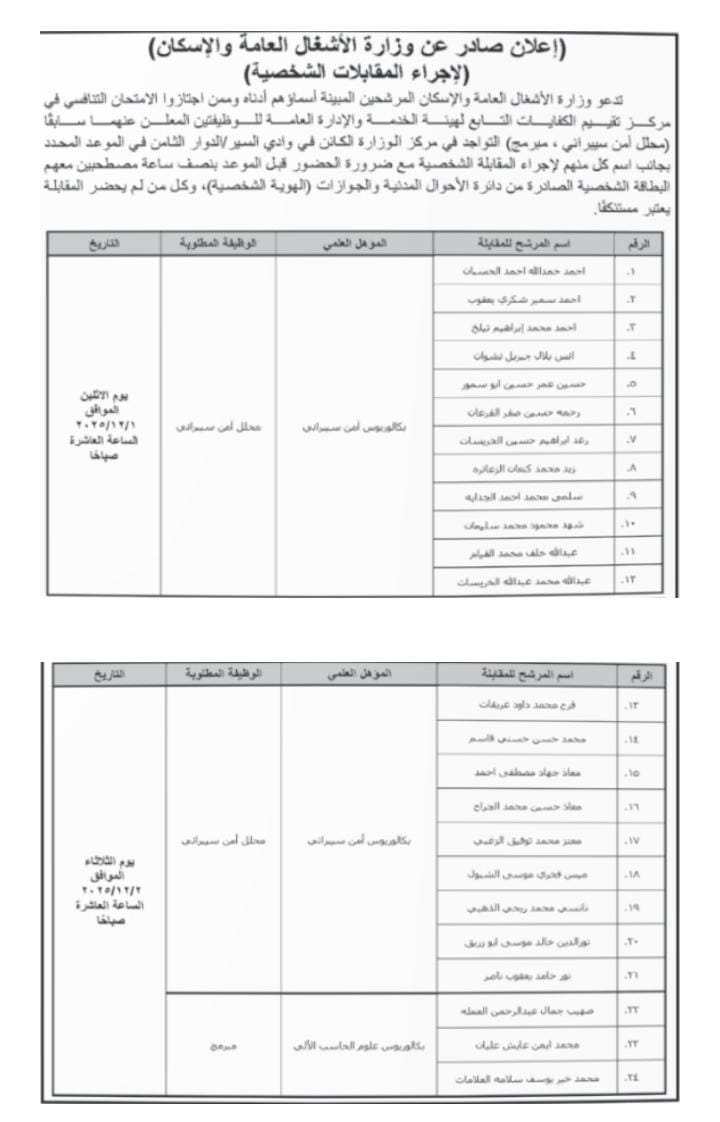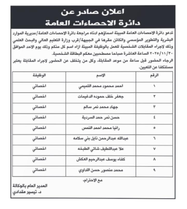 دعت مؤسسات حكومية، اليوم الاحد التالية أسماؤهم لاجراء المقابلة الشخصية.