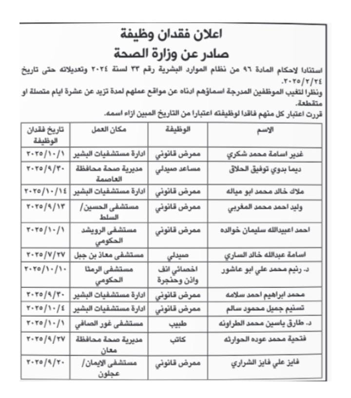 أعلنت وزارة الصحة عن فقدان عدد من الموظفين لوظائفهم، وذلك استناداً لأحكام المادة (96) من نظام إدارة الموارد البشرية رقم (33) لسنة 2024 وتعديلاته حتى تاريخ 24 فبراير 2025، وذلك بسبب التغيب غير المبرر عن مواقع العمل لمدة تزيد عن عشرة أيام، سواء كانت متصلة أو متقطعة.