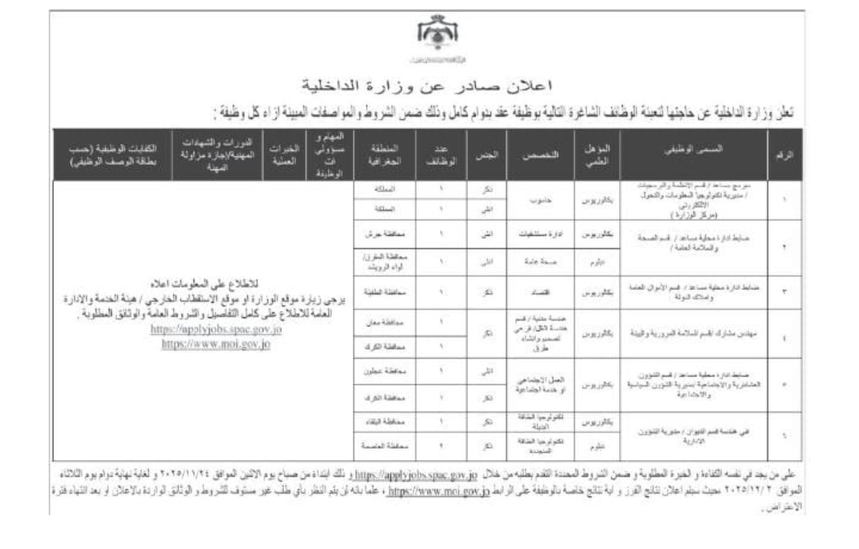 وزارة الداخلية تعلن حاجتها للتعاقد مع أردنيين من حملة البكالوريوس والدبلوم (تفاصيل)