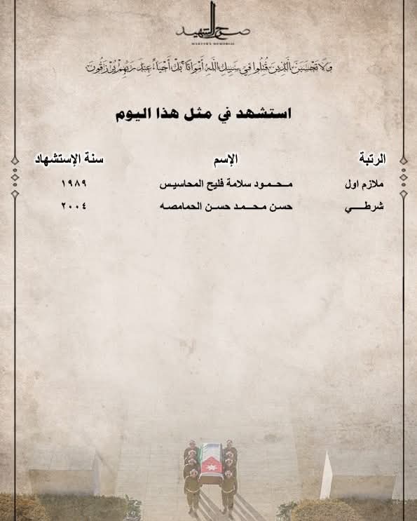 يظل صرح الشهيد شاهدًا خالدًا على عظمة التضحيات التي قدمها أبناء الأردن، الذين ارتقوا دفاعًا عن الوطن وحماية لترابه الطهور.   هذا الصرح ليس مجرد بناء حجري، بل هو رمز للعزة والكرامة، وذاكرة وطنية تحفظ أسماء الرجال الذين رووا الأرض بدمائهم الزكية. في رحاب صرح الشهيد، تلتقي الأجيال لتقرأ على جدرانه حكايات المجد، وتستذكر أسماء أبطالٍ عاشوا أوفياء ومضوا شهداء، لتبقى ذكراهم حيّة في قلب الوطن.   فهم الأحياء عند ربهم يُرزقون، وهم حماة الديار الذين سطروا بأرواحهم ملحمة الفداء. وقد ارتقى في سبيل الله والوطن شهداء من مختلف الرتب والميادين، ليجسدوا معنى الانتماء الصادق والولاء الراسخ، ومنهم: