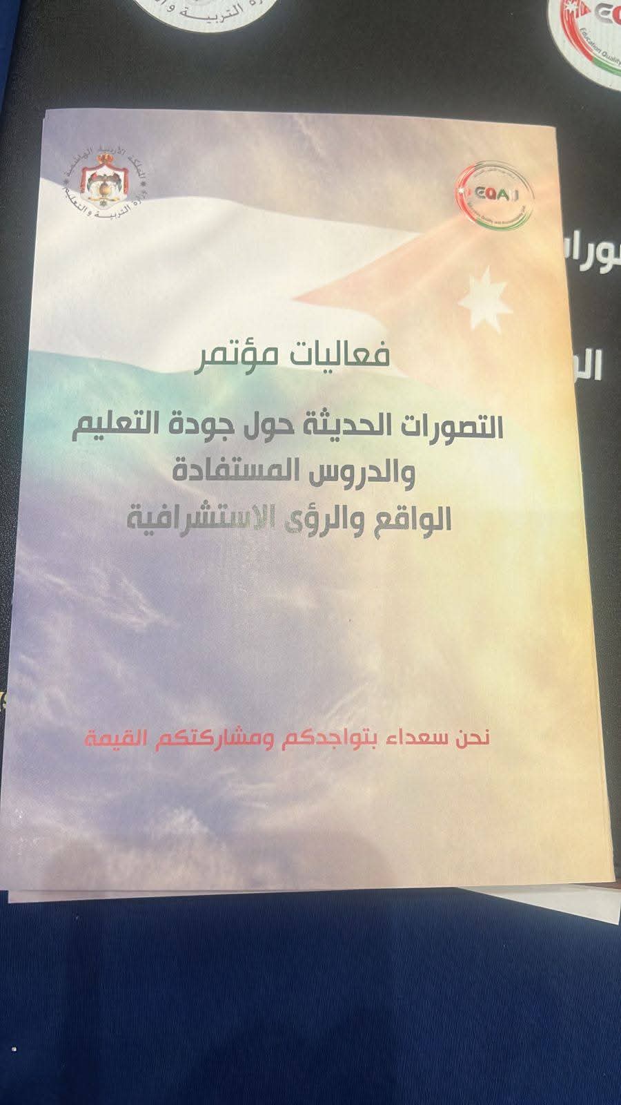 شارك مدير التربية والتعليم للواء الموقر الدكتور عبد الرحمن فنخير الزبن، ورئيسة قسم الإشراف التربوي الدكتورة آلاء أبو رمان، والمعلمة خولة النعيمي من مدرسة اللسين الأساسية المختلطة، في أعمال المؤتمر العلمي الأول بعنوان: "التصورات الحديثة حول جودة التعليم والدروس المستفادة وواقع البيئة الحقيقية"، والذي نظمته وزارة التربية والتعليم برعاية  الأمين العام للشؤون المالية والإدارية الأستاذة سحر الشخاترة. مندوبة عن معالي وزير التربية والتعليم الدكتور عزمي محافظة.