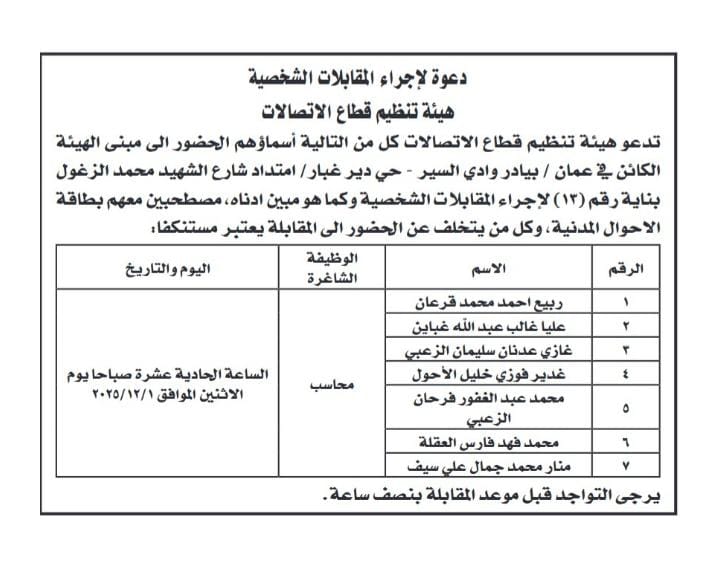 تدعو هيئة تنظيم قطاع الاتصالات التالية أسماؤهم اليوم الأربعاء لإجراء المقابلة الشخصية.