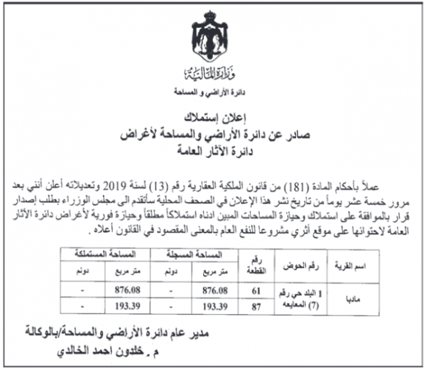 نيروز الإخبارية : أصدر مدير عام دائرة الاراضي والمساحة بالوكالة المهندس خلدون الخالدي، إعلانًا رسميًا يؤكد عزمه تقديم طلب استصدار قرار من مجلس الوزراء للموافقة على استملاك وحيازة قطعتي أرض في منطقة "حي المعايعة" في مدينة مادبا.