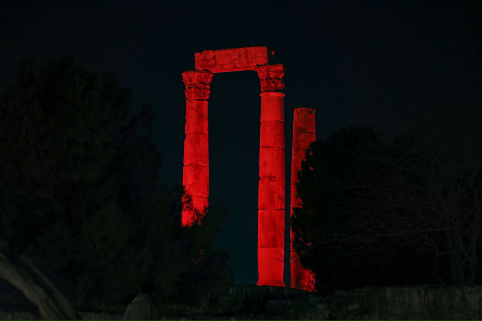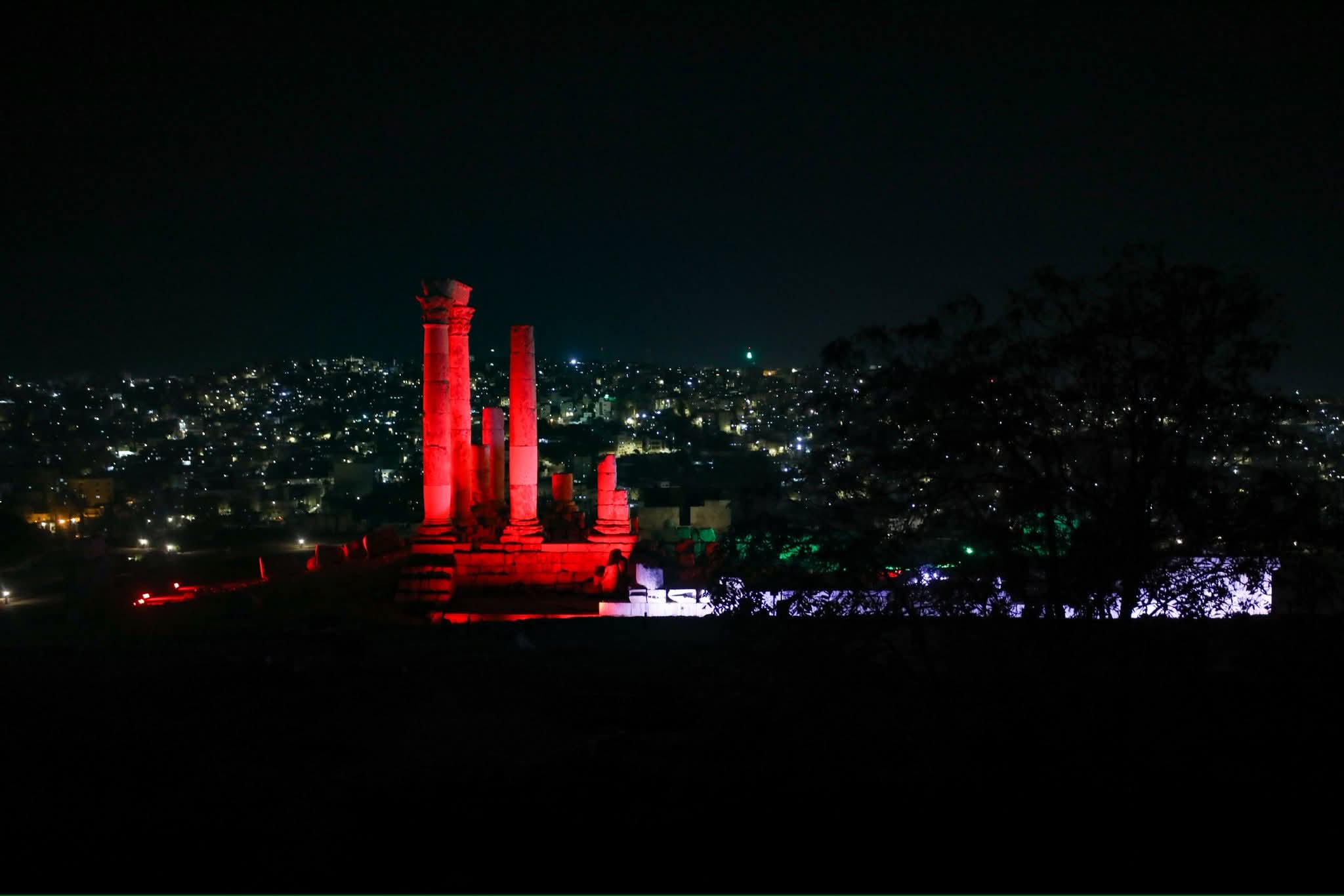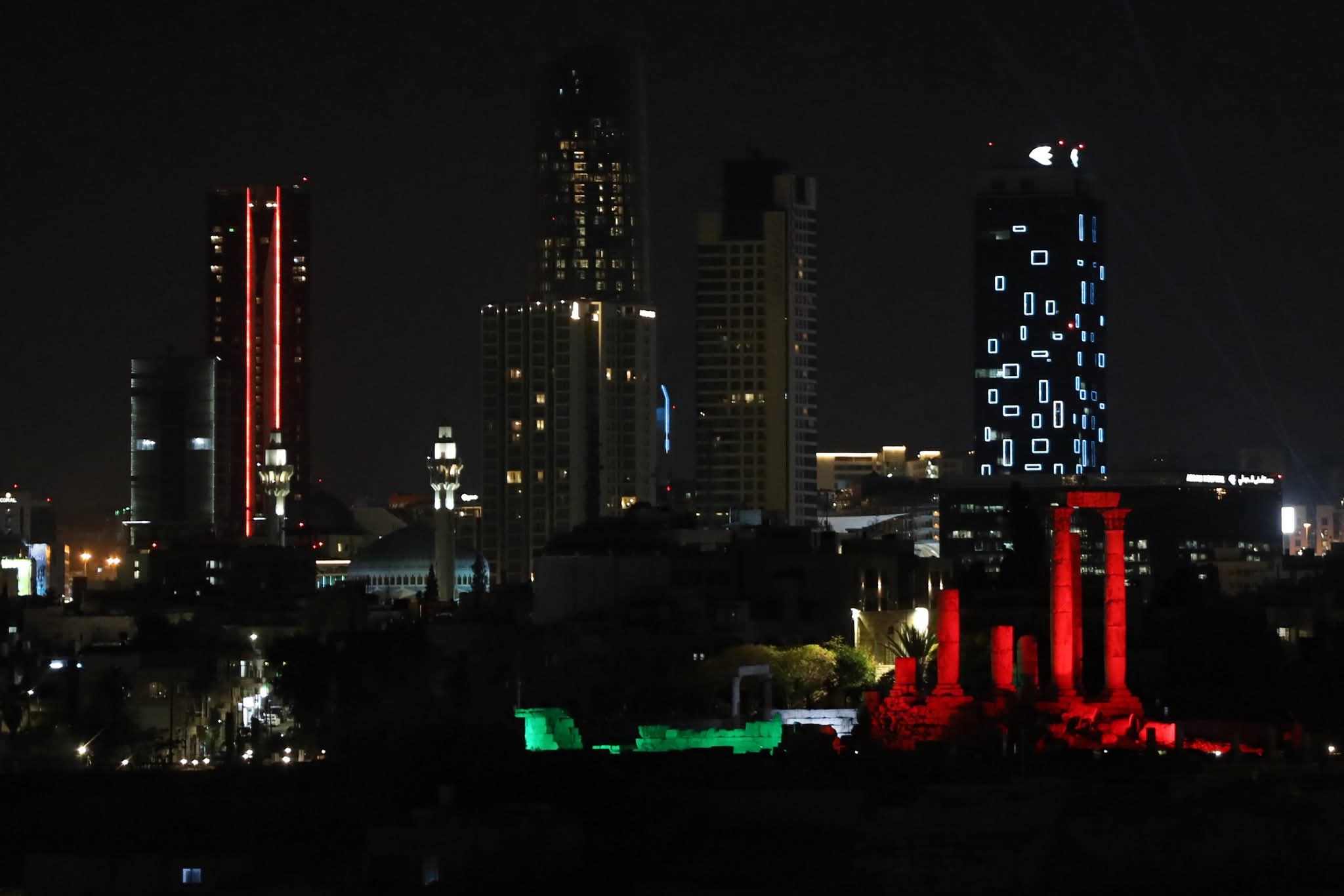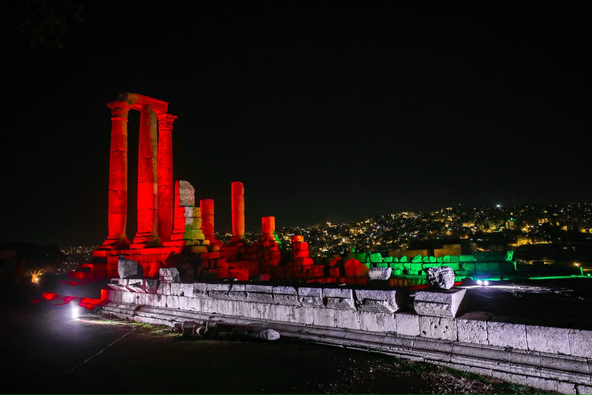 أضاءت أمانة عمّان الكبرى، مساء اليوم، أعمدة جبل القلعة والمدرج الروماني بألوان علم دولة الإمارات العربية المتحدة الشقيقة، وذلك احتفالًا بمناسبة عيد الاتحاد الـ54.