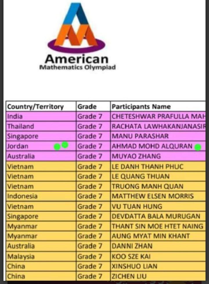 فاز الطالب الأردني أحمد محمد القرعان من الصف الثامن في مدرسة الملك عبدالله الثاني للتميز – الزرقاء بالمركز الأول مكرر عالميًا في مسابقة أولمبياد الرياضيات الأمريكي (AMO)، محققًا إنجازًا دوليًا يضاف إلى سجل نجاحات الطلبة الأردنيين.