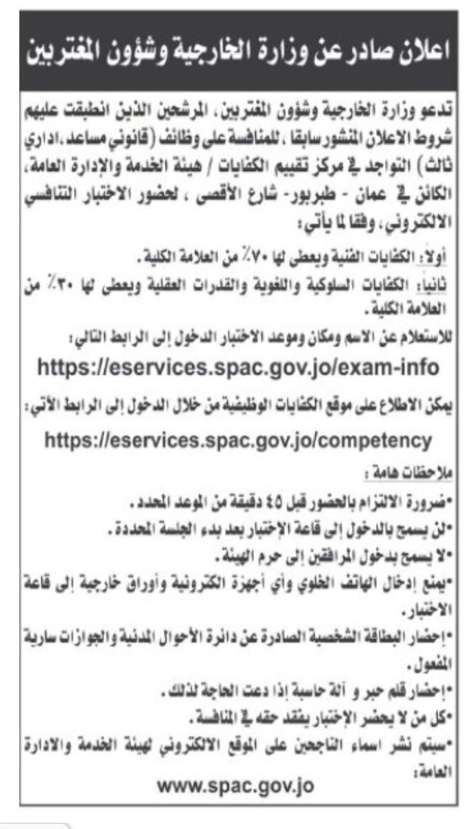 دعت وزارة الخارجية ، اليوم الاحد  المرشحين الذين انطبقت عليهم شروط الاعلان المنشور سابقا  لحضور الاختبار التنافسي.