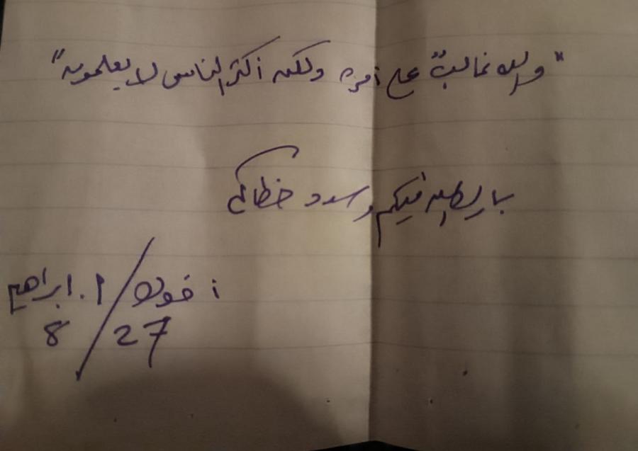 وتضمنت الرسالة الخطية، من الشهيد حذيفة الكحلوت "أبو عبيدة"، إلى شقيقه إبراهيم، سؤالا عن حالة عائلته والمكان الذين استقروا إليه بفعل النزوح المتواصل.