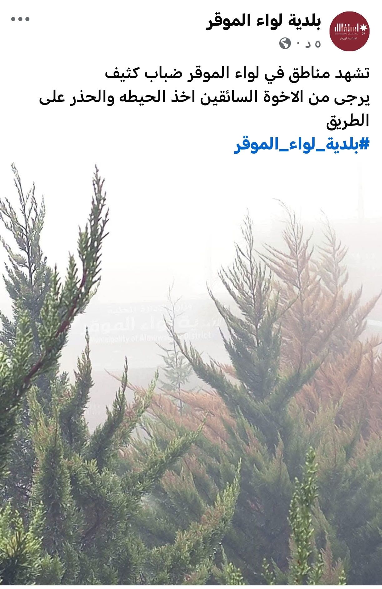 نشرت بلدية الموقر عبر صفحتها الرسمية على فيسبوك تحذيراً للسائقين من الضباب الكثيف الذي يغطي المناطق الواقعة ضمن نطاقها.