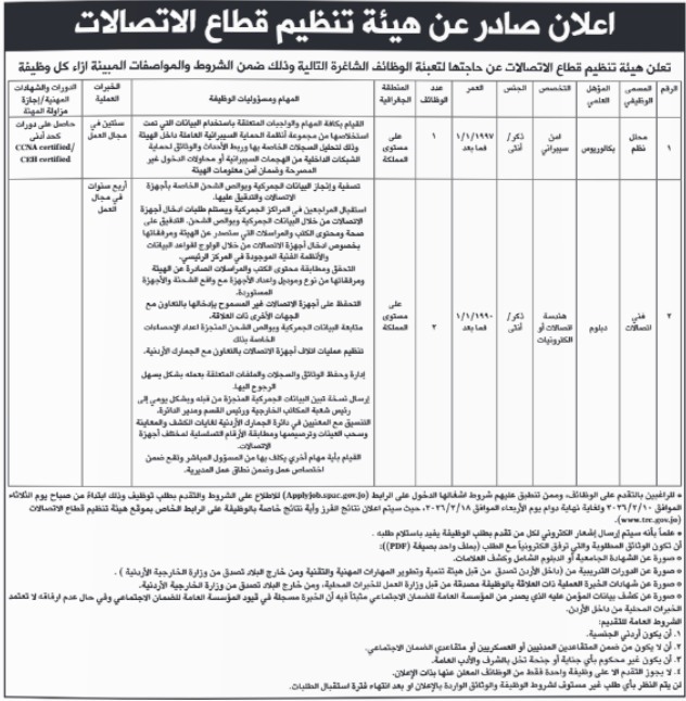 اعلنت هيئة تنظيم قطاع الاتصالات اليوم الاثنين عن حاجتها لتعبئة وظائف شاغرة.