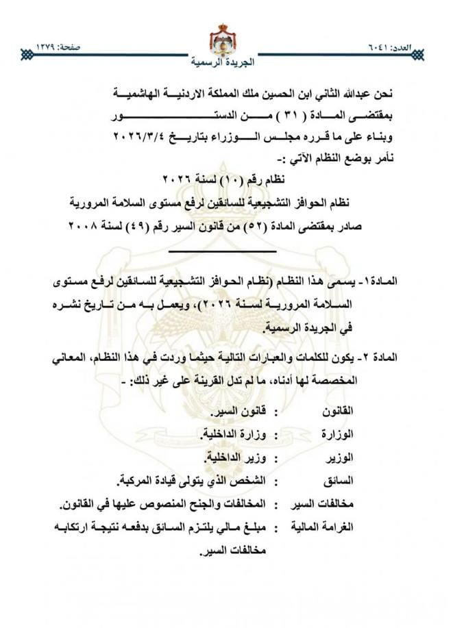 دخل نظام الحوافز التشجيعية للسائقين لرفع مستوى السلامة المرورية الصادر بمقتضى المادة (٥٢) من قانون السير رقم (٤٩) لسنة ٢٠٠٨، حيز التنفيذ، بعد نشره في الجريدة الرسمية اليوم الخميس.