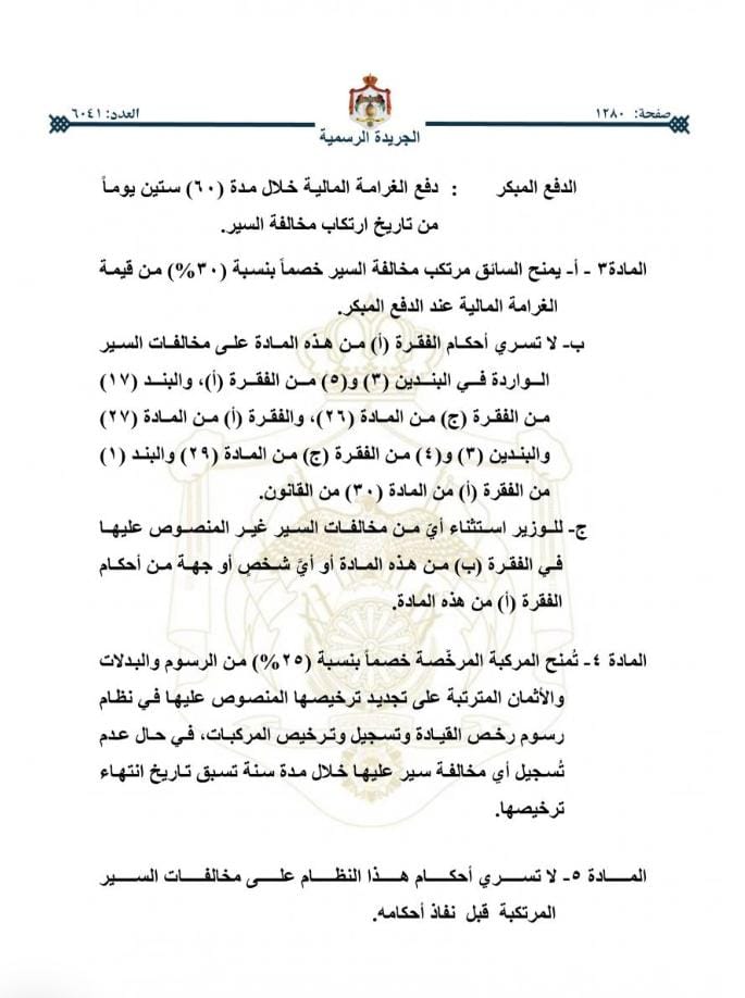 كما سيتمّ منح كل من ارتكب مخالفة سير خصماً بنسبة 30% من قيمة المخالفة في حال تسديدها خلال 30 يوماً من تاريخ ارتكاب المخالفة، وخصماً بنسبة 20% من قيمة المخالفة في حال تسديدها خلال 90 يوماً من تاريخ ارتكاب المخالفة.