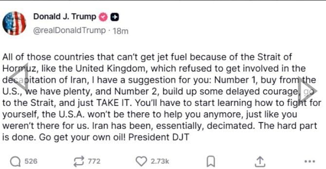 وأشار ترمب إلى أن إيران "تم تدميرها بشكل أساسي" وأن المرحلة الأصعب من الحرب قد انتهت، داعياً الدول التي تعتمد على نفط الخليج إلى التحرك بنفسها لتأمين احتياجاتها من الطاقة عبر مضيق هرمز.